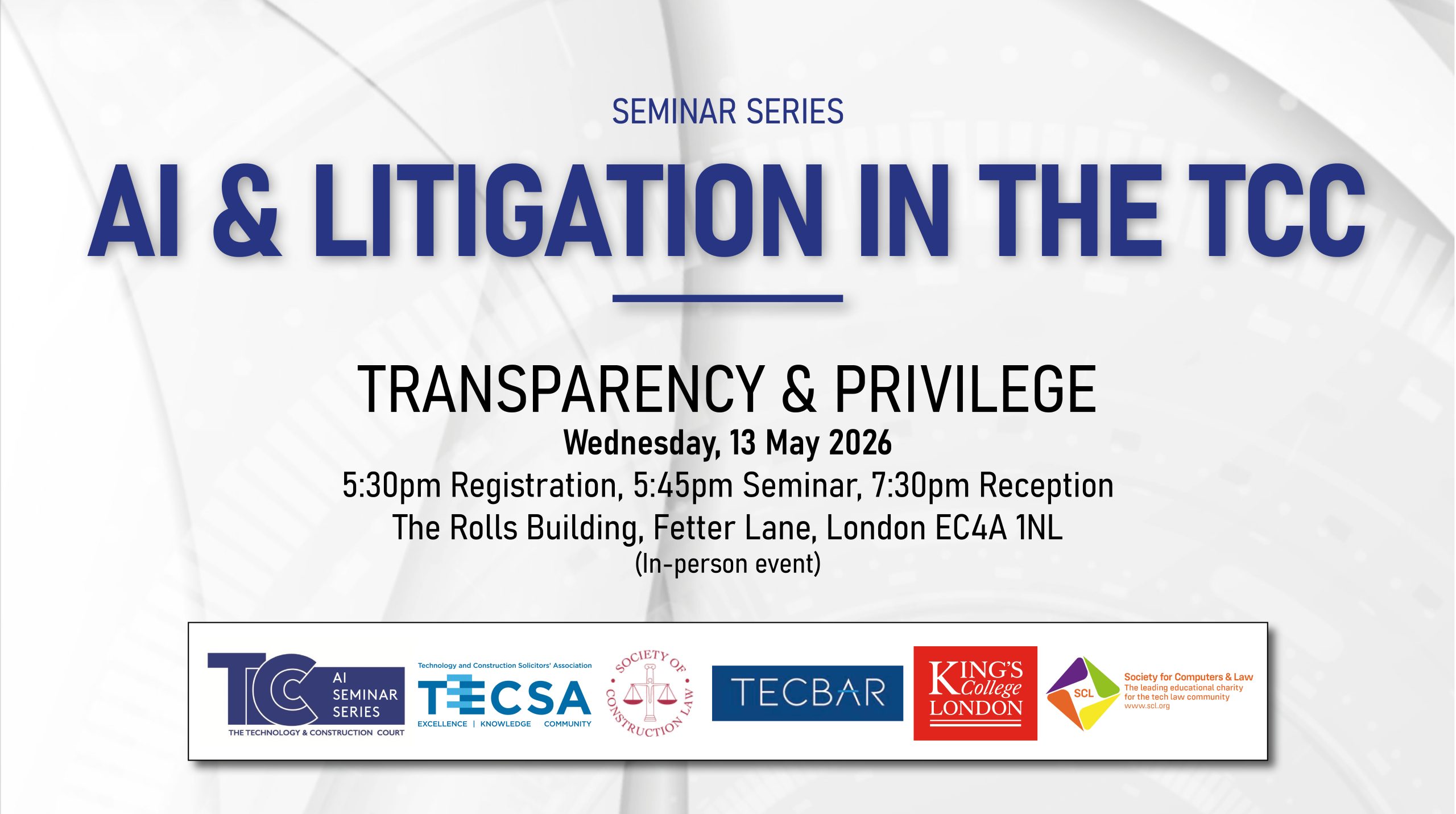 The Technology and Construction Court, TECSA, TECBAR, The Society of Construction Law, The Society for Computers & Law, and King’s College London are delighted to announce this latest seminar in the series, focusing on transparency, privilege, and emerging best practice in the responsible use of AI.
